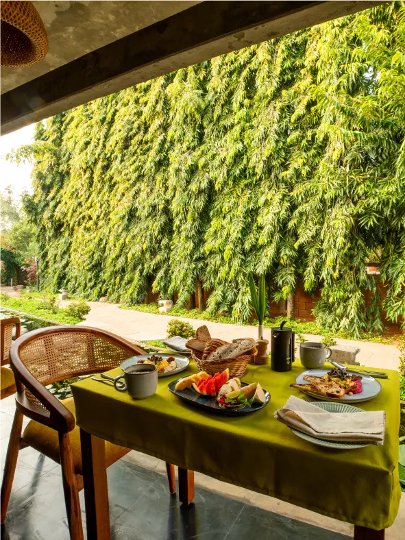 Rooted in sustainability and guided by sensory pleasure, our culinary philosophy celebrates mindful indulgence. The menu draws inspiration from CGH Earth’s Conscious Cuisine ethos and the rich, vibrant food traditions of Tamil Nadu & Auroville—where purpose, place, and flavour come together at the table. Fresh herbs and vegetables are harvested from our organic kitchen garden, complemented by artisanal Auroville produce—cheeses, breads, chocolates, condiments, and grains—that elevate every dish.