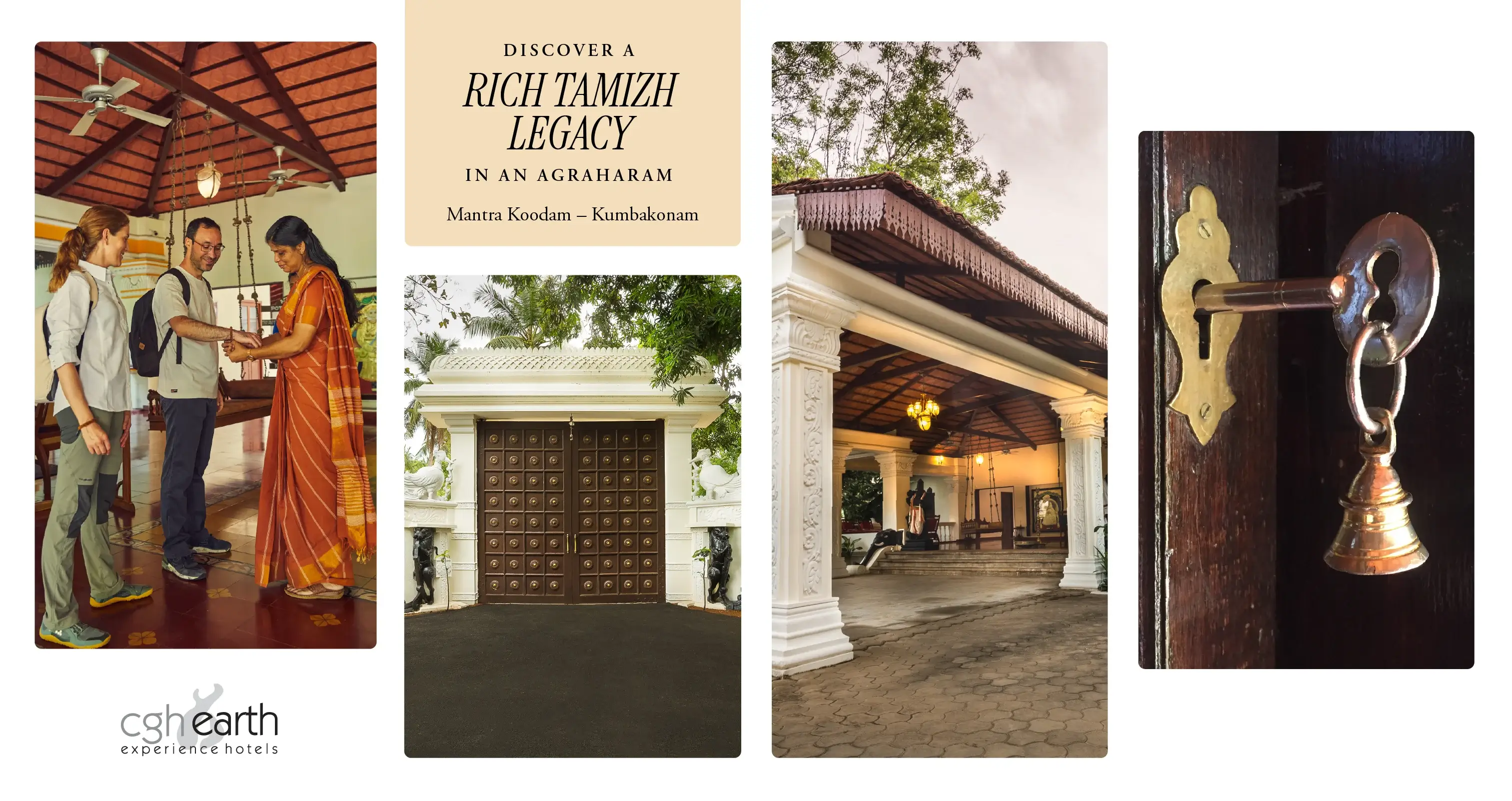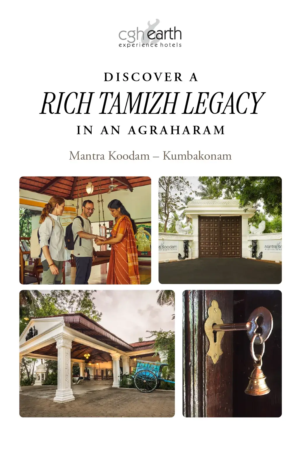 A CGH Earth holiday is unique because of our responsible travel experiences that protect the environment, benefit the community, and adopt the local ethos. Also, every hotel & resort offers unique experiences that can only be enjoyed as our privileged guest. These are our exclusives at CGH Earth Mantra Koodam in Kumbakonam.
